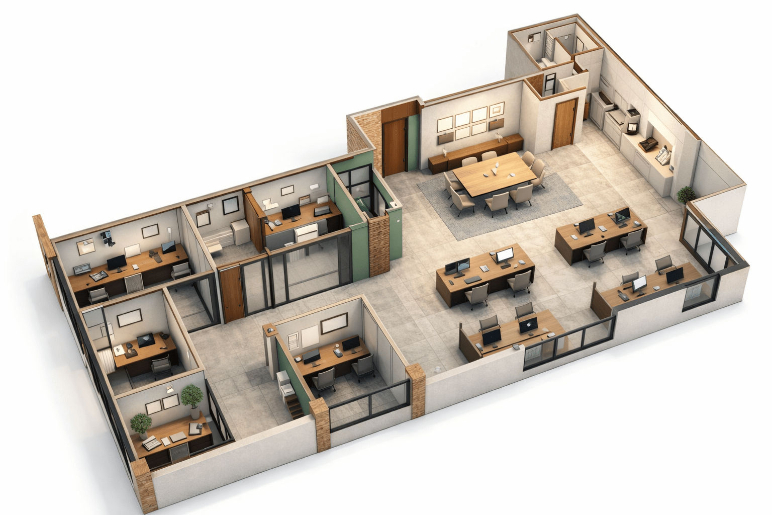 Partimos de un local existente para transformarlo en un centro de negocios versátil que combina zonas abiertas de trabajo, áreas privadas y espacios de reunión, optimizando cada rincón para potenciar la colaboración y el confort.