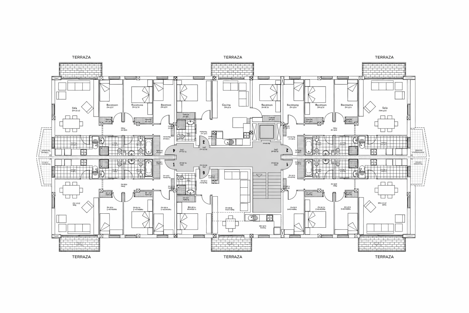 Las viviendas se organizan alrededor de un núcleo central de comunicaciones que optimiza los recorridos y garantiza privacidad. Los espacios interiores priorizan la luz natural y la funcionalidad, con zonas de día abiertas que conectan con terrazas y amplían la percepción de amplitud. La distribución clara entre áreas de día y de noche favorece el confort cotidiano.
