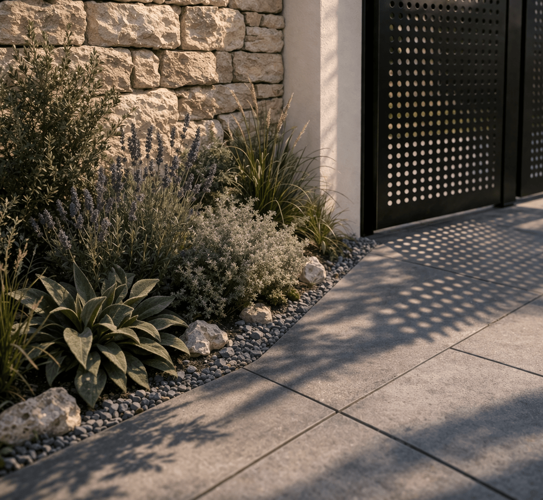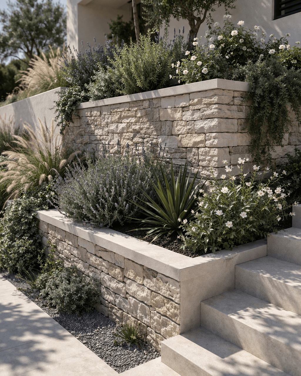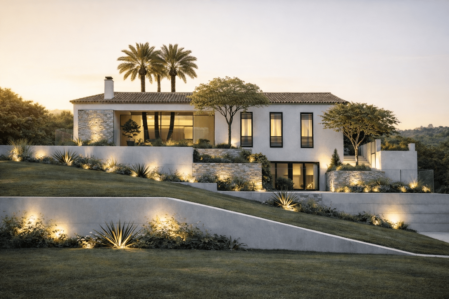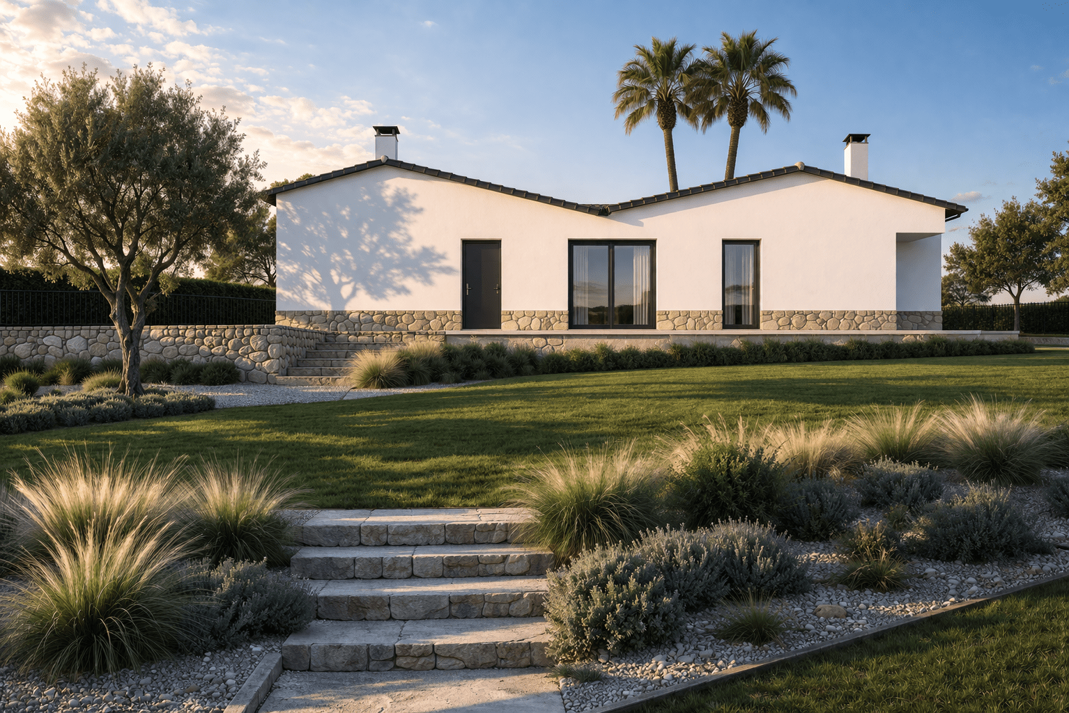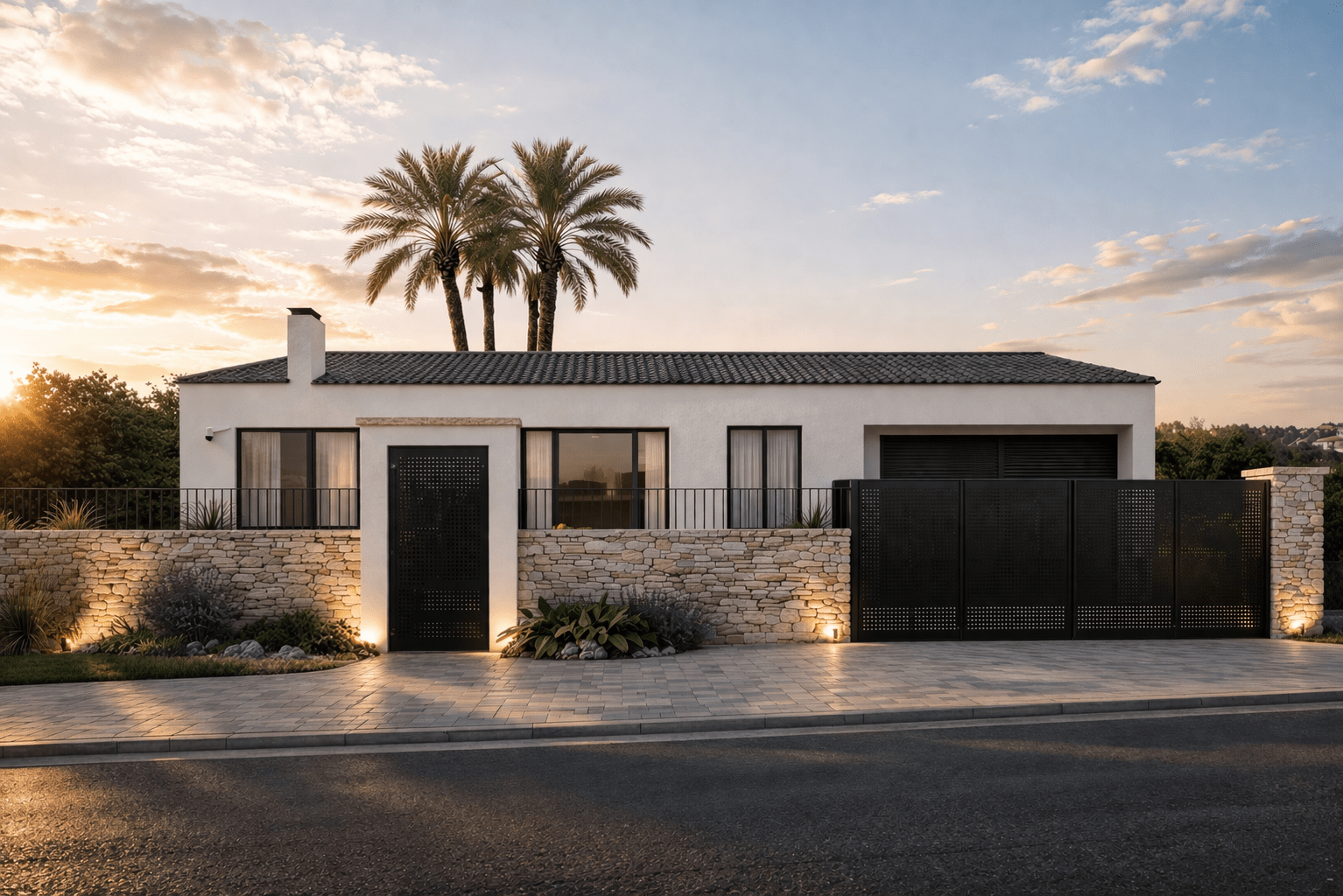 Esta vivienda de arquitectura contemporánea combina líneas limpias, materiales naturales y una cuidada integración con el paisaje. Su fachada principal destaca por la elegancia del volumen blanco, el contraste con la piedra natural y los cerramientos metálicos en negro, aportando carácter y privacidad desde el exterior.
