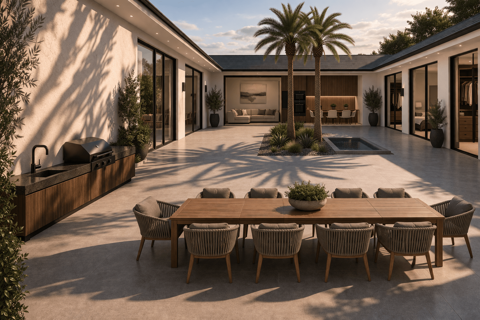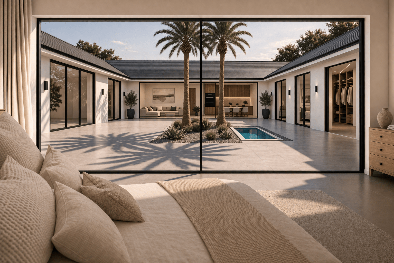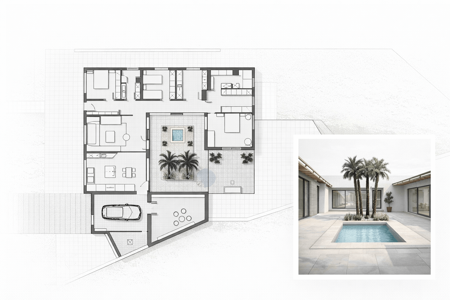 El verdadero corazón del proyecto es su patio interior con palmeras, un espacio que organiza la casa y conecta visualmente las distintas estancias. Este patio actúa como un oasis privado, llenando de luz natural el interior y generando una atmósfera serena y sofisticada, donde la vegetación se convierte en protagonista.