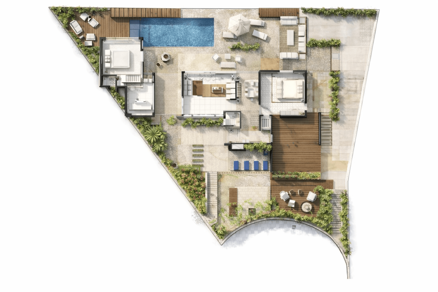 La zona exterior, con la piscina y los espacios de estar, la planteamos como una prolongación del hogar, un lugar para compartir, descansar y vivir el clima de Olivella durante todo el año. Cada decisión —la orientación, los recorridos, la elección de materiales— responde a nuestra intención de lograr una casa cómoda, funcional y profundamente ligada al lugar.